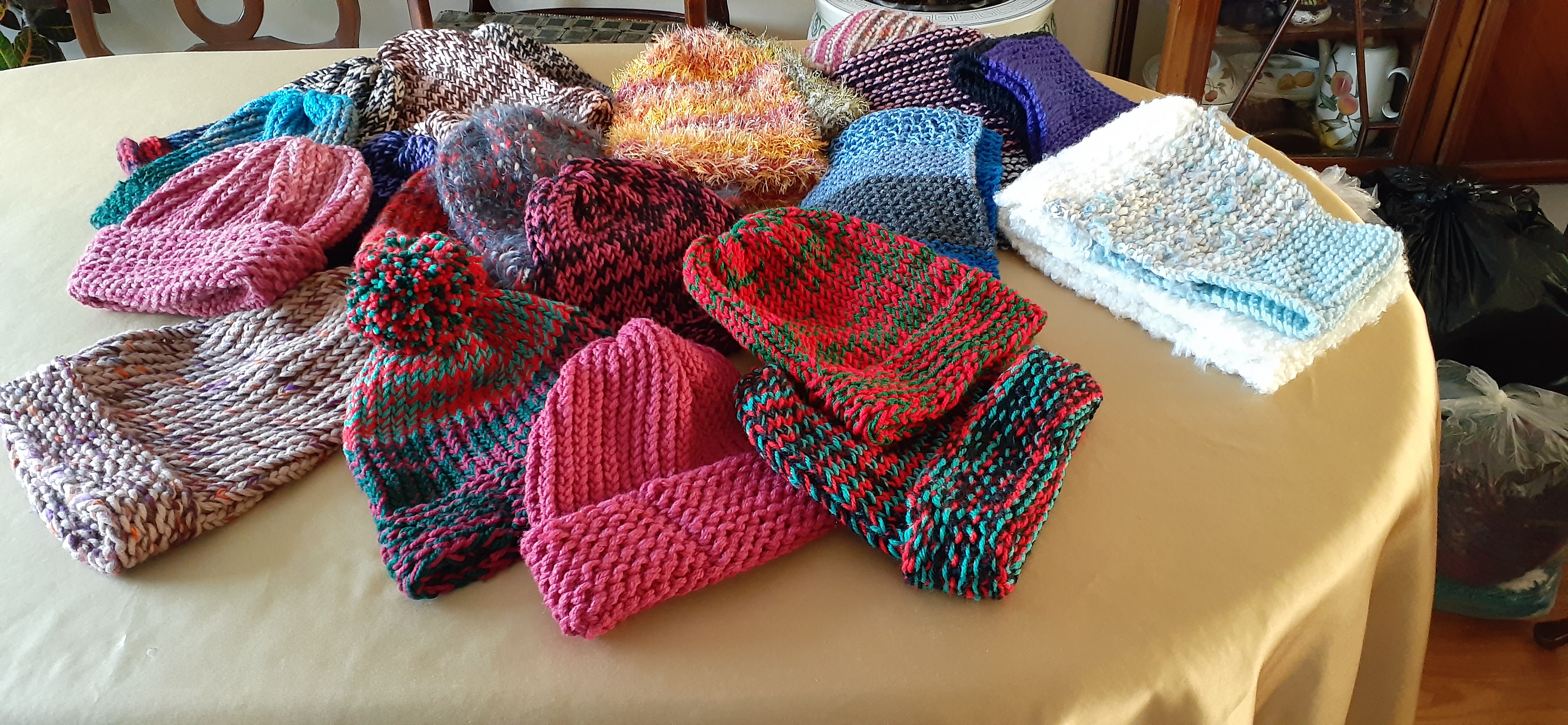 Thanks to Beth for her amazing blankets, Kathy for her gorgeous baby jackets Toni for he lovely hats and scarves and Sally a hat and scarf set and an afghan.